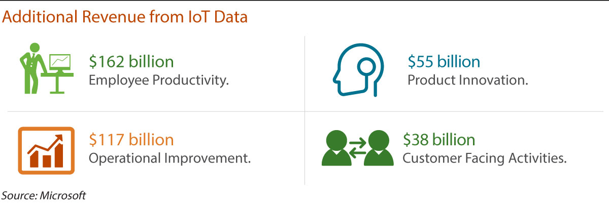 To monetize insights that are worth billions, IoT gives manufacturers growing opportunities both internally and externally to save costs, increase revenue from better product sales, pursue services-oriented business models, and improve internal processes. And manufacturers also have the opportunity for additional revenue generation through the sale of data, insights, and/or advice to benefit the ecosystem stakeholders.